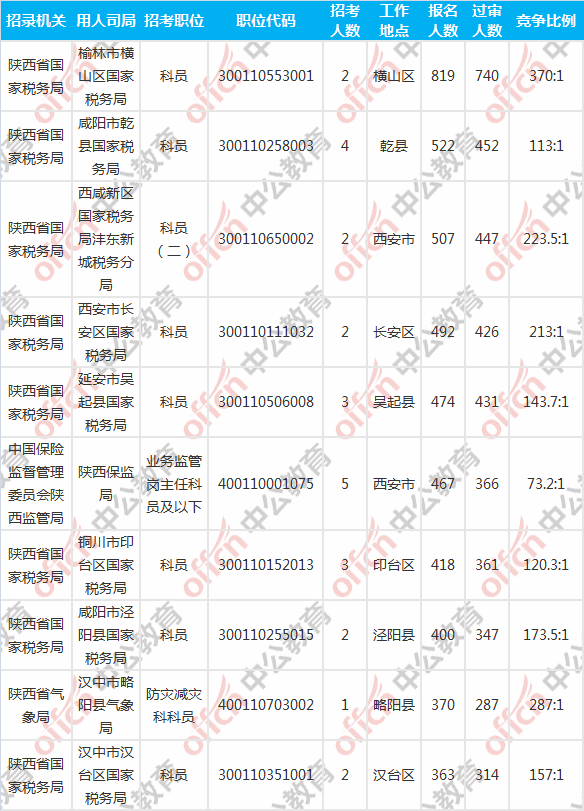 報(bào)名人數(shù)前十的職位主要集中在陜西省國(guó)家稅務(wù)局、中國(guó)保險(xiǎn)監(jiān)督管理委員會(huì)陜西監(jiān)管局、陜西省氣象局等部門,具體信息如下: