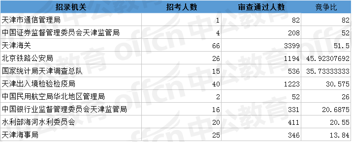 為幫助廣大考生更清晰的了解今日報名情況,中公網(wǎng)校整理了審核通過人數(shù)前十位的部門以及競爭比例最激烈的十大部門,供廣大考生參考:
