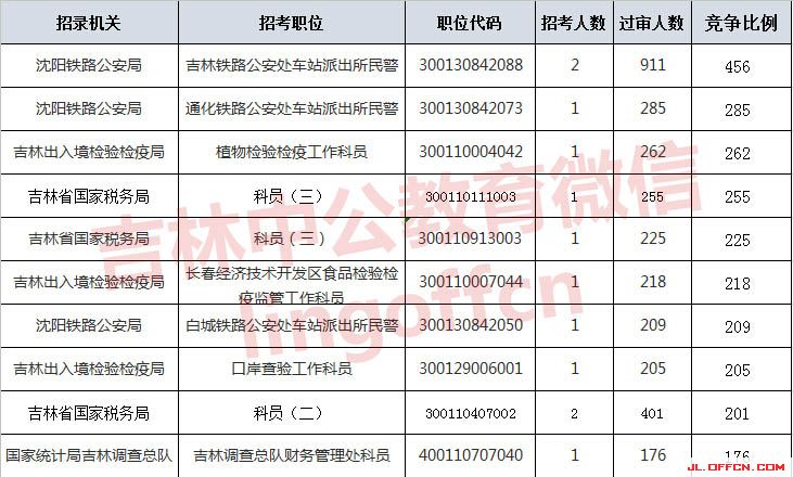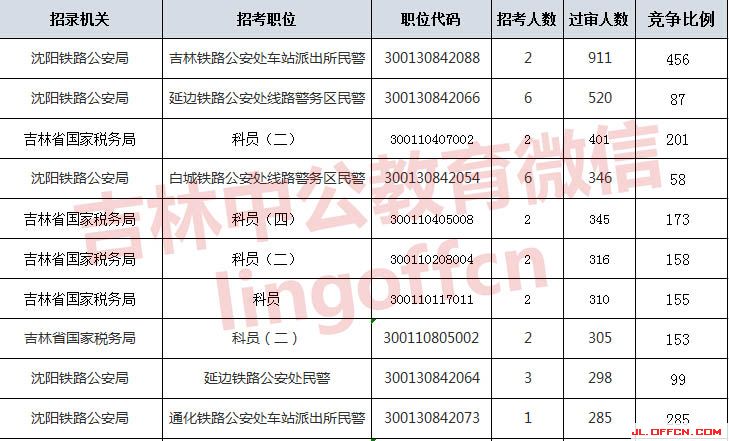 報名通過審核人數(shù)前十的職位主要集中在沈陽鐵路公安局、吉林國家稅務局等部門,具體信息如下: