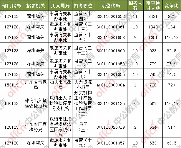 報名通過審核人數(shù)前十的職位主要集中在深圳海關、廣東省氣象局、珠海出入境檢驗檢疫局等部門,具體信息如下: