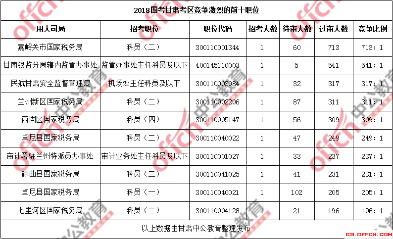 報(bào)名通過審核人數(shù)前十的職位主要集中在嘉峪關(guān)市國家稅務(wù)局、甘南銀監(jiān)分局轄內(nèi)監(jiān)管辦事處、民航甘肅安全監(jiān)督管理局部門,具體信息如下: