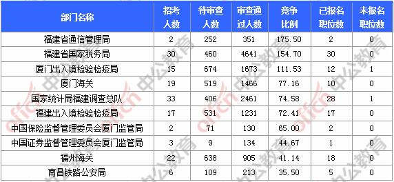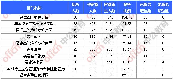 截止到6日16時(shí),通過(guò)審核人數(shù)前三位的部門(mén)依次是:福建省國(guó)家稅務(wù)局、國(guó)家統(tǒng)計(jì)局福建調(diào)查總隊(duì)、廈門(mén)出入境檢驗(yàn)檢疫局,三部門(mén)通過(guò)審核總?cè)藬?shù)達(dá)8775人,占通過(guò)審核總?cè)藬?shù)的59.39%。