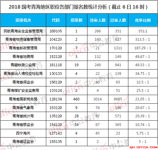 以下是6日16時(shí)各部門報(bào)名人數(shù)統(tǒng)計(jì)分析,其中中國(guó)民航青海安全監(jiān)督管理局、青海省物資儲(chǔ)備管理局、青海省郵政管理局等三個(gè)部門競(jìng)爭(zhēng)最激烈,競(jìng)爭(zhēng)比均已超過187:1。