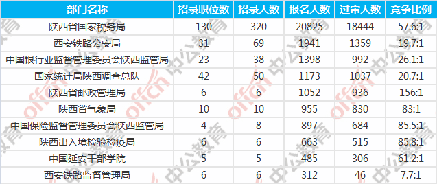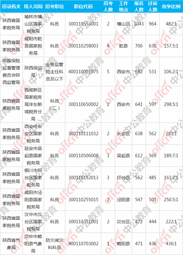 報名人數(shù)前十的職位主要集中在陜西省國家稅務局、中國保險監(jiān)督管理委員會陜西監(jiān)管局、陜西省氣象局等部門,具體信息如下: