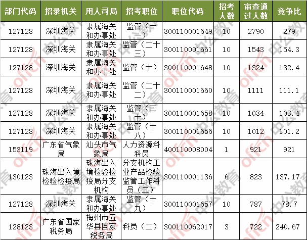 報(bào)名通過審核人數(shù)前十的職位主要集中在深圳海關(guān)、廣東省氣象局、珠海出入境檢驗(yàn)檢疫局等部門,具體信息如下: