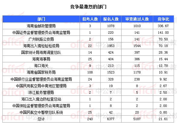 截至11月7日16時,據(jù)中公網(wǎng)校統(tǒng)計,國考職位中工作地點在海南的職位通過審核總?cè)藬?shù)為5187人,共有8個職位無人通過審核,其中還有部分待審核的人數(shù)高達1190人,平均競爭比例為21.61:1。