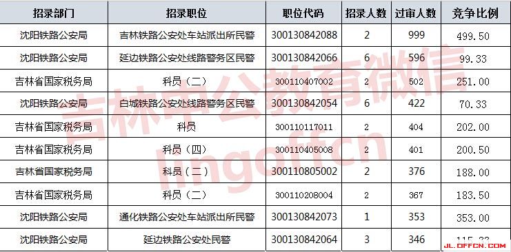 報名通過審核人數(shù)前十的職位主要集中在沈陽鐵路公安局、吉林國家稅務局等部門,具體信息如下: