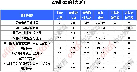 截止到7日16時(shí),通過審核人數(shù)前三位的部門依次是:福建省國家稅務(wù)局、國家統(tǒng)計(jì)局福建調(diào)查總隊(duì)、廈門出入境檢驗(yàn)檢疫局,三部門通過審核總?cè)藬?shù)達(dá)10966人,占通過審核總?cè)藬?shù)的56.54%。