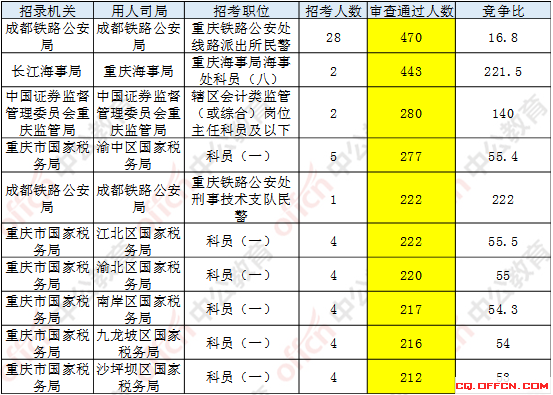 報(bào)名通過審核人數(shù)前十的職位主要集中在成都鐵路公安局、長江海事局、中國證券監(jiān)督管理委員會(huì)重慶監(jiān)管局、重慶市國家稅務(wù)局四個(gè)部門。報(bào)名通過人數(shù)位居第一的職位,為成都鐵路公安局重慶鐵路公安處線路派出所民警一職,經(jīng)常進(jìn)行夜間巡線任務(wù),適合男性。符合《公務(wù)員錄用體檢特殊標(biāo)準(zhǔn)(試行)》、《公安機(jī)關(guān)錄用人民警察體能測評(píng)項(xiàng)目和標(biāo)準(zhǔn)(暫行)》所要求的標(biāo)準(zhǔn)。專業(yè)要求為法律、信息、公安類相關(guān)專業(yè),需為中共黨員或共青團(tuán)員,且限應(yīng)屆高等院校畢業(yè)生,可見許多應(yīng)屆生在大學(xué)期間申請成為中共黨員或共青團(tuán)員,表現(xiàn)了許多應(yīng)屆生為黨為人民服務(wù)的心。報(bào)名通過人數(shù)位居第二的長江海事局重慶海事局重慶海事局海事處科員(八)一職,是前幾天占競爭比例鰲頭的職位,該職位對基層工作最低年限為3年,主要招考為已步入社會(huì)工作的人員,對學(xué)位、政治面貌、服務(wù)基層項(xiàng)目工作經(jīng)歷無限制。錄用后兼任海巡艇船員,簽訂5年期服務(wù)協(xié)議,服從調(diào)配,由此看來,具有吃苦精神的大有人在。