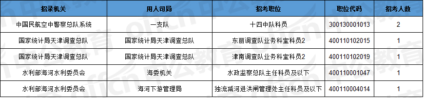 截止到8日09時,工作地點在天津的職位共有5個無人報考,占全部職位的2.4%。下圖是無人報考職位一覽表,中公網(wǎng)校專家建議廣大考生多關(guān)注一些較冷職位,避免激烈競爭,結(jié)合自身條件,找到屬于自己的職位。