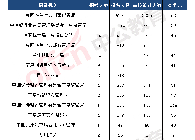 截止到11月8日9時(shí),報(bào)名通過審核人數(shù)前十的職位主要為寧夏回族自治區(qū)國家稅務(wù)局、寧夏回族自治區(qū)郵政管理局,具體信息如下: