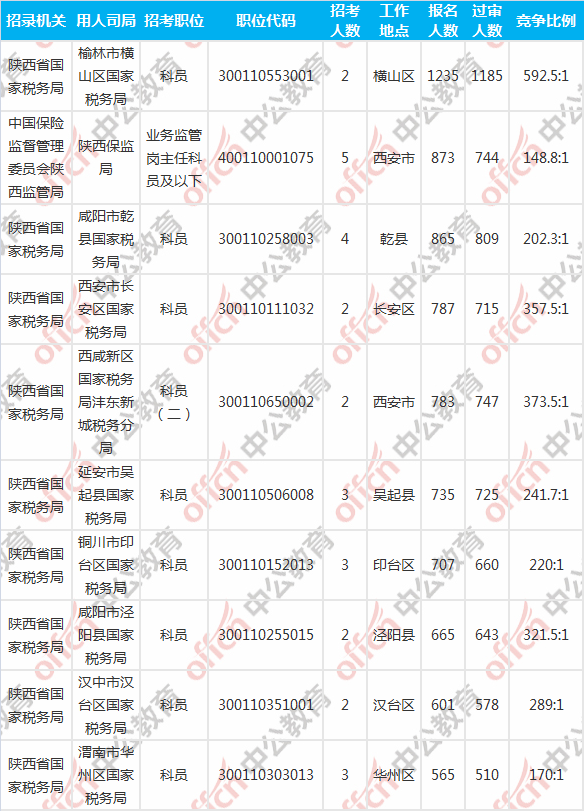 報(bào)名人數(shù)前十的職位主要集中在陜西省國(guó)家稅務(wù)局、中國(guó)保險(xiǎn)監(jiān)督管理委員會(huì)陜西監(jiān)管局兩大部門,具體信息如下: