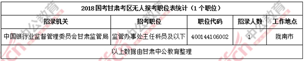 11月8日16時,工作地點在甘肅的職位共有1個職位無人通過審核,占全部職位的0.5%,1個職位無人報考,占全部職位的0.5%。下面是無人待審及無人報報職位一覽表,中公網(wǎng)校專家建議廣大考生多關(guān)注一些較冷職位,避免激烈競爭,結(jié)合自身條件,找到屬于自己的職位。