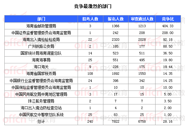截止到8日16時(shí),通過審核人數(shù)前三位的部門依次是:海南出入境檢驗(yàn)檢疫局海南省國家稅務(wù)局、海南省郵政管理局、,三部門通過審核總?cè)藬?shù)達(dá)4791人,占通過審核總?cè)藬?shù)的70.09%。