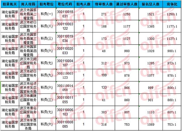 截止到11月8日16時,競爭比例的職位為武漢市國家稅務局第二稽查局科員(一)(職位代碼:300110018031)一職,招錄1人,截止到5日16時過審人數(shù)為1250人。
