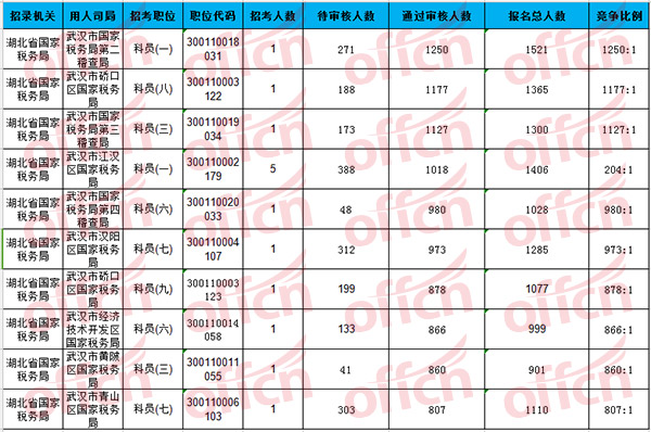 報名通過審核人數(shù)前十的職位集中在湖北省國家稅務局,具體信息如下: