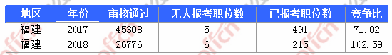 截至11月8日18時(shí),據(jù)中公網(wǎng)校統(tǒng)計(jì),國考職位中工作地點(diǎn)在福建的職位3302人待審 ,26776人通過審核,共報(bào)名30078人,其中有6個(gè)職位無人報(bào)名,并且全為福建海事局,平均競爭比例為102.59:1。