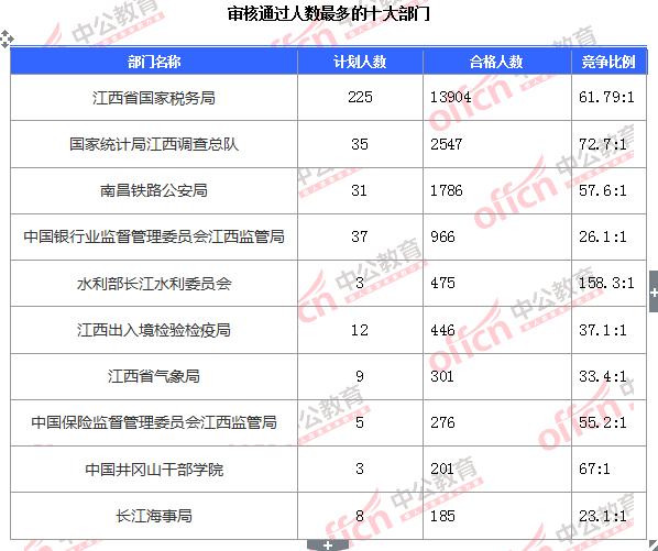截止到8日17:30時,通過審核人數(shù)前三位的部門依次是:江西省國家稅務局、國家統(tǒng)計局江西調查總隊、南昌鐵路公安局,三部門通過審核總人數(shù)達18237人,占通過審核總人數(shù)的85.3%。