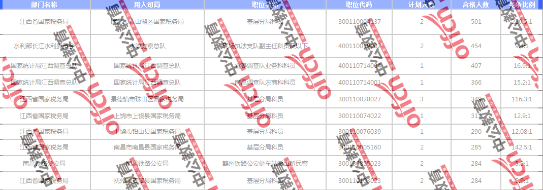 報名通過審核人數(shù)前十的職位主要集中在國家統(tǒng)計局江西調查總隊 水利部長江水利委員會 國家統(tǒng)計局江西調查總隊等部門,具體信息如下:
