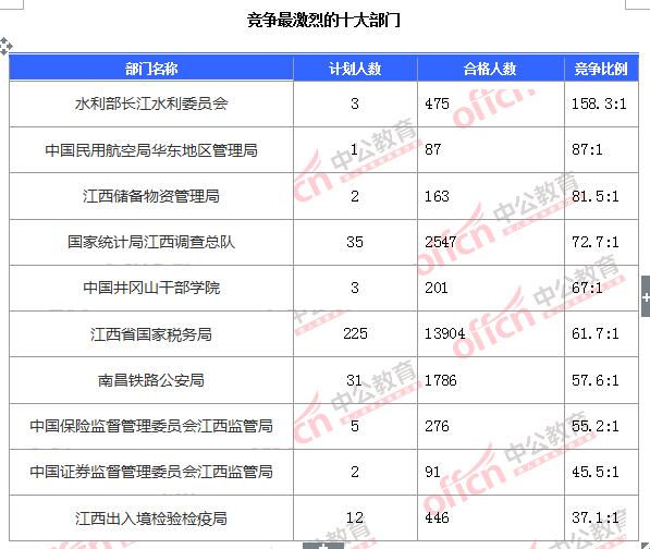 為幫助廣大考生更清晰的了解今日報名情況,中公網(wǎng)校整理了審核通過人數(shù)前十位的部門以及競爭比例最激烈的十大部門,供廣大考生參考:
