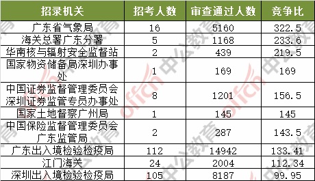 為幫助廣大考生更清晰的了解今日報名情況,中公網(wǎng)校整理了審核通過人數(shù)前十位的部門以及競爭比例最激烈的十大部門,供廣大考生參考:
