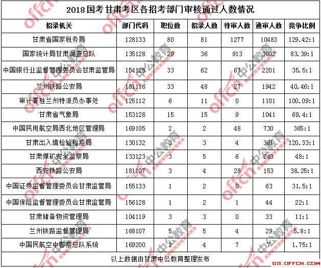 11月8日17:30,通過(guò)審核人數(shù)前三位的部門依次是:甘肅省國(guó)家稅務(wù)局、國(guó)家統(tǒng)計(jì)局甘肅調(diào)查總隊(duì)、中國(guó)銀行業(yè)監(jiān)督管理委員會(huì)甘肅監(jiān)管局。三部門通過(guò)審核總?cè)藬?shù)達(dá)15686人,占通過(guò)審核總?cè)藬?shù)的73.20%。