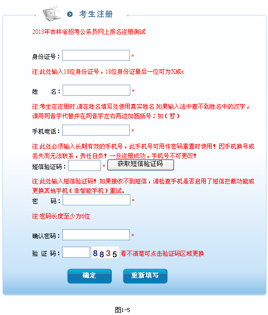 未注冊考生請注冊后再登錄,點擊圖1-4中的‘注冊新用戶’進入注冊頁面如圖1-5,請考生按提示填寫注冊信息。點擊‘確定’提交注冊信息,注冊后將返回圖1-4頁面進行登錄(返回登陸時自動把身份證號填充到身份證號文本框內)。