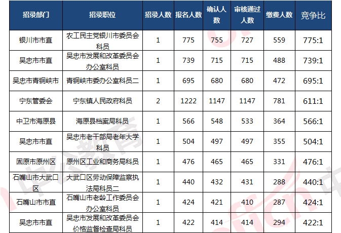 截止到3月31日10:00,報名競爭最激烈前三位職位依次是:農(nóng)工民主黨銀川市委員會科員、吳忠市發(fā)展和改革委員會辦公室科員、青銅峽市委辦公室科員二。三職位報名人數(shù)達2173人,占報名總?cè)藬?shù)的4%。為幫助廣大考生更清晰的了解今日報名情況,中公網(wǎng)校整理了競爭最激烈的十大職位,供廣大考生參考,競爭比為775:1。
