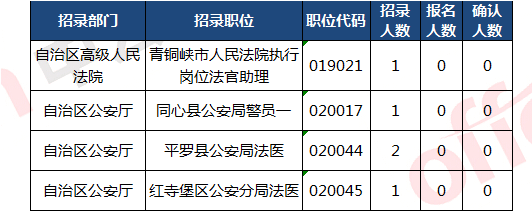截止到31日10:00,無人報考職位:共有4個是:青銅峽市人民法院執(zhí)行崗位法官助理、同心縣公安局警員一、平羅縣公安局法醫(yī)、紅寺堡區(qū)公安分局法醫(yī)、。下面是無人報考職位一覽表,中公網(wǎng)校專家建議廣大考生多關(guān)注一些較冷職位,避免激烈競爭,結(jié)合自身條件,找到屬于自己的職位。