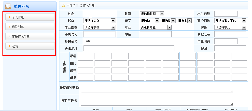 三:輸入報(bào)名信息。在報(bào)名信息列表里面有四行,個(gè)人信息-崗位列表-查看報(bào)名信息-退出。需要一步一步按照順序進(jìn)行填寫,所以請(qǐng)廣大考生慎重填寫。