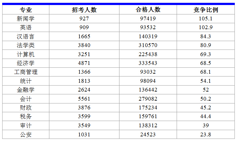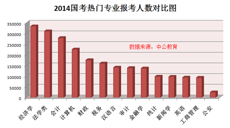 中公網(wǎng)校專家對2014國家公務(wù)員考試報名人數(shù)進行了深入分析,統(tǒng)計出報名人數(shù)最多的十大專業(yè)供考生參考,經(jīng)濟學居首,達到33萬之多;新聞學競爭比例,達105︰1。