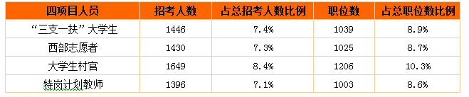 2014年,在四項目人員中,大學生村官的招錄比例也是四類人群中的,職位占總職位數(shù)的10%,人數(shù)達8.4%。