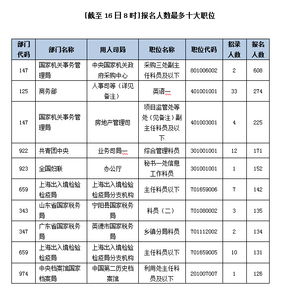 在眾多職位當(dāng)中,國家機關(guān)事務(wù)管理局中央國家機關(guān)政府采購中心采購三處副主任科員及以下這一職位爭得首日報名人數(shù)最多“桂冠”,而今天仍然居高不下,審核通過人數(shù)比昨天增加190人。該職位計劃招錄2人,競爭比例高達304:1。截至今日8時,報名人數(shù)最多的前三職位依然是昨天排前三的職位。