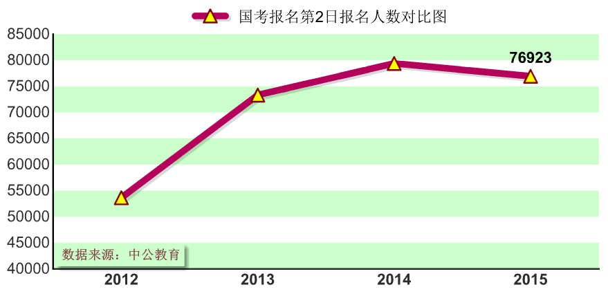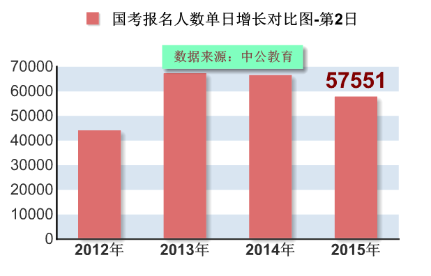 國考報名第2天,2015國考報名人數(shù)單日增長57551人,趨近6萬人。在四年中不算。