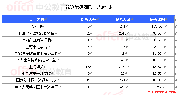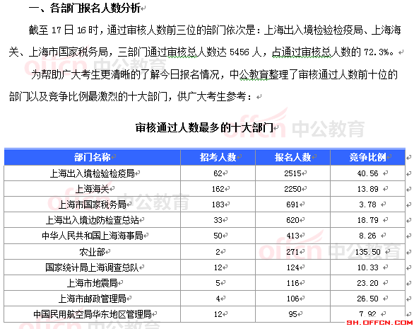 10月17日16時(shí),2015國(guó)家公務(wù)員考試報(bào)名進(jìn)入第3天。據(jù)中公網(wǎng)校統(tǒng)計(jì),國(guó)考職位中工作崗位在上海的職位通過(guò)審核的總?cè)藬?shù)為7474人,共有42個(gè)職位無(wú)人通過(guò)審核,平均競(jìng)爭(zhēng)比例為11.64:1??忌枳⒁膺@并不是最終的報(bào)名人數(shù),審核時(shí)間是截至2014年10月26日18:00。