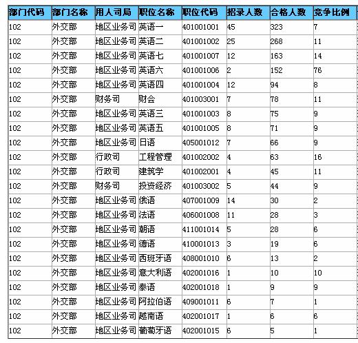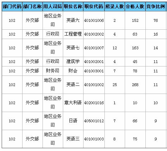 外交部競爭最激烈的職位是地區(qū)業(yè)務(wù)司的英語六一職,僅招錄2人。截至17日16時,已有152人通過了審核,競爭比高達76:1。該職位的工作主要是研究國際陸地、海洋邊界方面的外交實踐;處理有關(guān)邊界涉外事務(wù)及領(lǐng)土、地圖、地名等涉外案件;參加與鄰國陸地邊界劃界、勘界、聯(lián)合檢查及日常管理工作;參與海洋劃界、共同開發(fā)等相關(guān)外交談判工作。