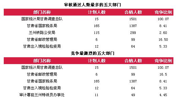 截至17日16時,通過審核人數(shù)前三位的部門依次是:國家統(tǒng)計局甘肅調查總隊、甘肅省國家稅務局、蘭州鐵路公安局,三部門通過審核總人數(shù)達3187人,占通過審核總人數(shù)的92%。 為幫助廣大考生更清晰的了解今日報名情況,中公網(wǎng)校整理了審核通過人數(shù)前五位的部門以及競爭比例最激烈的五大部門,供廣大考生參考:
