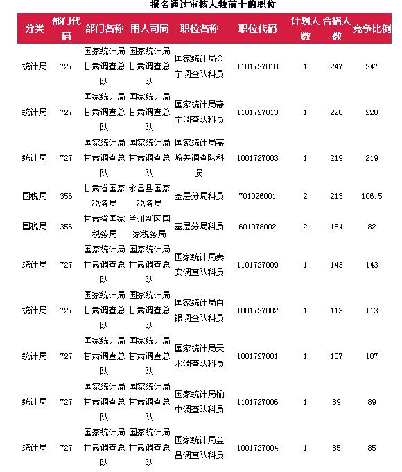 截至17日16時,招錄比例的職位為國家統(tǒng)計局甘肅調查總隊國家統(tǒng)計局會寧調查隊科員,招錄1人,通過人數(shù)為247人,競爭比例為247:1
