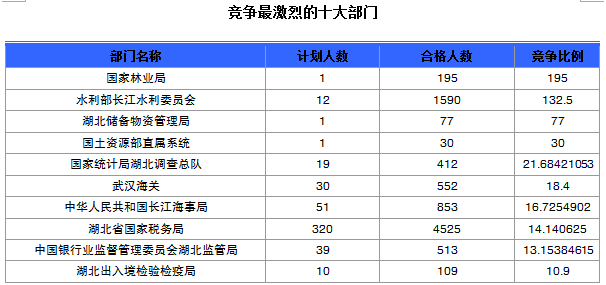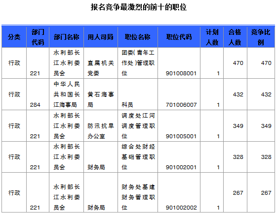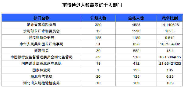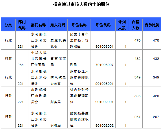 報名通過審核人數(shù)前十的職位主要集中在水利部長江水利委員會、湖北省國家稅務局等部門,具體信息如下: