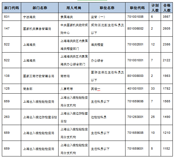 另外截至今日8時(shí),2015國(guó)考職位中已有四個(gè)職位審核人數(shù)超過(guò)了兩千人,分別是寧波海關(guān)隸屬海關(guān)的監(jiān)管一、國(guó)家機(jī)關(guān)事務(wù)管理局的中央國(guó)家機(jī)關(guān)政府采購(gòu)中心采購(gòu)三處副主任科員及以下、上海海關(guān)關(guān)區(qū)內(nèi)隸屬海關(guān)稽查部門的海關(guān)稽查及上海海關(guān)關(guān)區(qū)內(nèi)隸屬海關(guān)辦公綜合部門的辦公綜合等四個(gè)。破兩千的職位中,有三個(gè)職位為海關(guān)相關(guān),可見(jiàn)海關(guān)職位作為國(guó)考中的傳統(tǒng)熱門魅力仍不減。