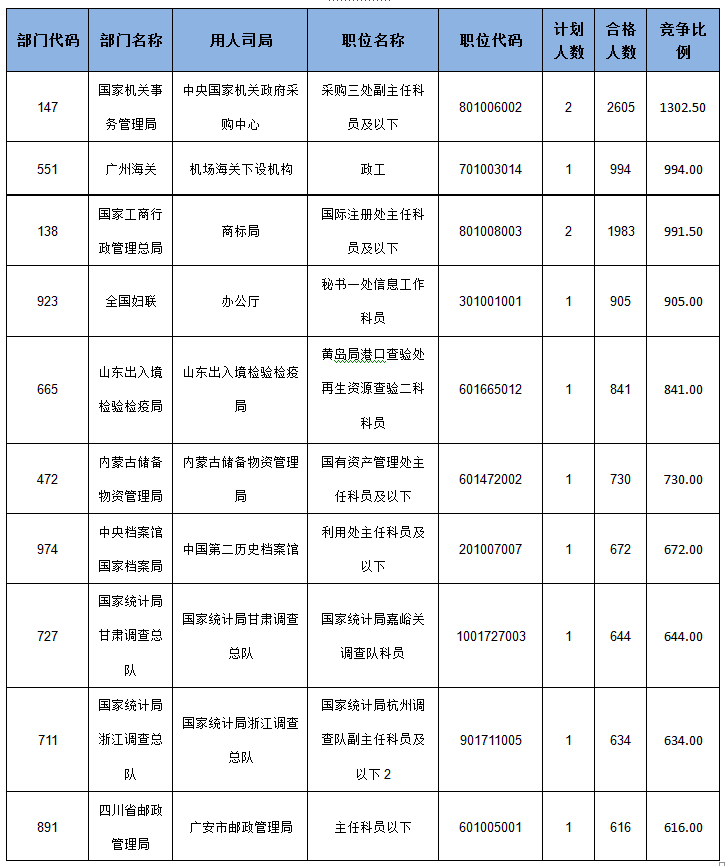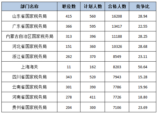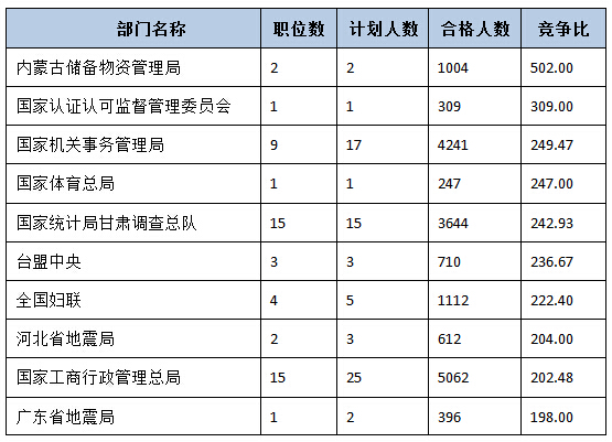 在參與招錄的490個(gè)部門中,山東省國(guó)家稅務(wù)局審核通過(guò)的人數(shù)仍位居榜首,已過(guò)審16208人;內(nèi)蒙古儲(chǔ)備物資管理局職位的競(jìng)爭(zhēng)最為激烈,招錄2人,過(guò)審1004人,平均競(jìng)爭(zhēng)比達(dá)502:1。