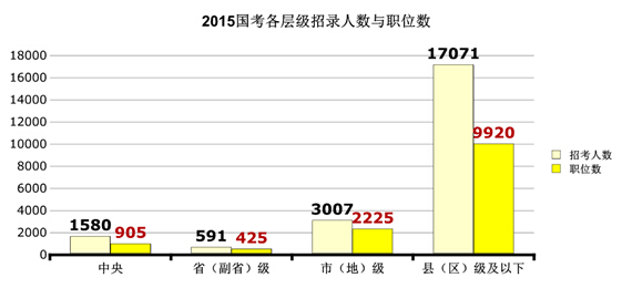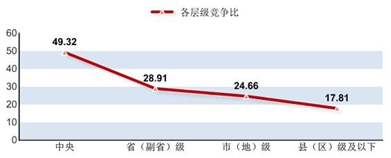 中央、省、市、縣四級(jí)目前競(jìng)爭(zhēng)比是逐漸下降的,中央競(jìng)爭(zhēng)比,為49.32:1,接近50人爭(zhēng)一個(gè)職位,縣(區(qū))級(jí)及以下最低,僅為17.81:1。中公教育專家分析,考生都偏愛(ài)中央層級(jí)的職位,都想進(jìn)入“高層”。 9月25日,人社部聯(lián)合多個(gè)部委正式公布了《關(guān)于做好艱苦邊遠(yuǎn)地區(qū)基層公務(wù)員考試錄用工作的意見(jiàn)》,從六個(gè)方面明確了降低了邊遠(yuǎn)地區(qū)公務(wù)員的進(jìn)入門(mén)檻,且基層公務(wù)員工資改革在即,基層職位的發(fā)展前景廣闊。而在2015國(guó)考公告中也明確指出:對(duì)西部地區(qū)和艱苦邊遠(yuǎn)地區(qū)職位、基層職位和特殊專業(yè)職位等,在劃定最低合格分?jǐn)?shù)線時(shí)將予以政策傾斜。中公教育專家建議考生可將眼光放長(zhǎng)遠(yuǎn),多關(guān)注西部邊遠(yuǎn)地區(qū)職位,積極響應(yīng)國(guó)家的優(yōu)待政策,下基層去鍛煉自己,為將來(lái)的宏圖偉業(yè)奠定基石!