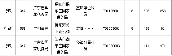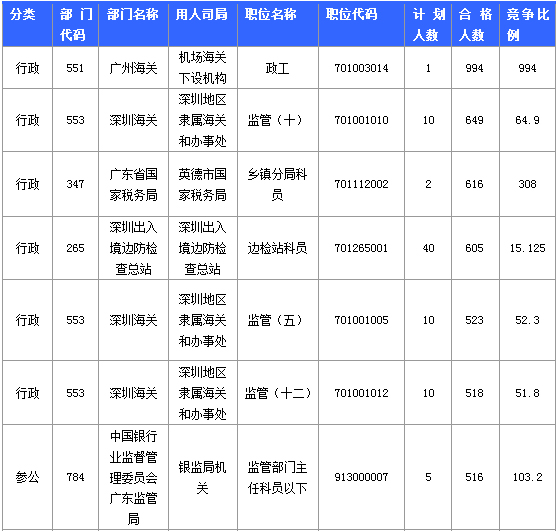 截至21日8時(shí),招錄比例的職位為廣州海關(guān)政工一職,招錄1人,通過(guò)人數(shù)為994人,報(bào)名通過(guò)審核人數(shù)前十的職位主要集中在廣州海關(guān)、深圳海關(guān)、廣東省國(guó)家稅務(wù)局等部門,具體信息如下: