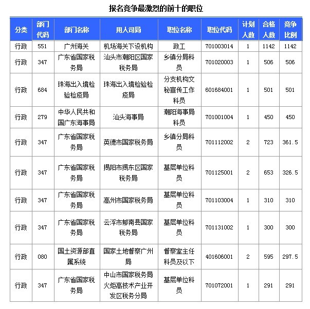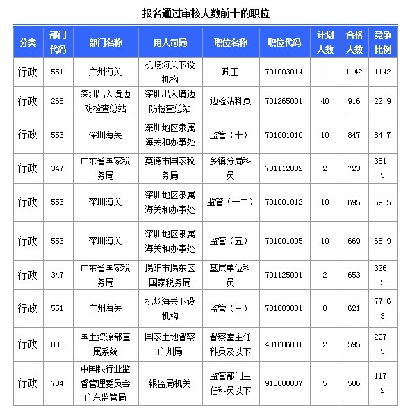 報(bào)名通過審核人數(shù)前十的職位主要集中在廣州海關(guān)、廣東省國家稅務(wù)局、珠海出入境檢驗(yàn)檢疫局等部門,具體信息如下: