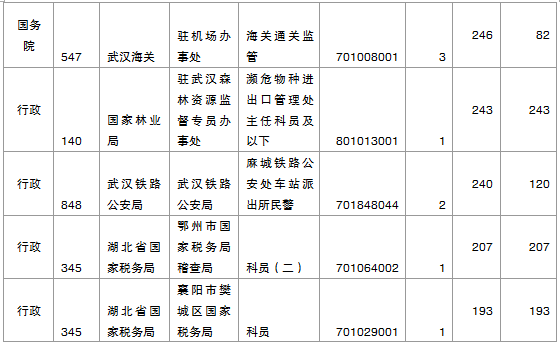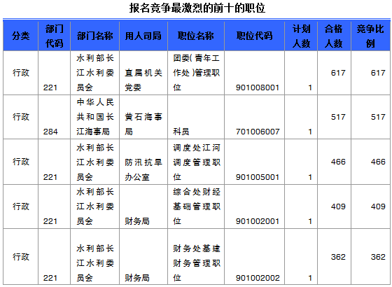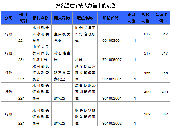 報名通過審核人數(shù)前十的職位主要集中在水利部長江水利委員會、湖北省國家稅務局等部門,具體信息如下:
