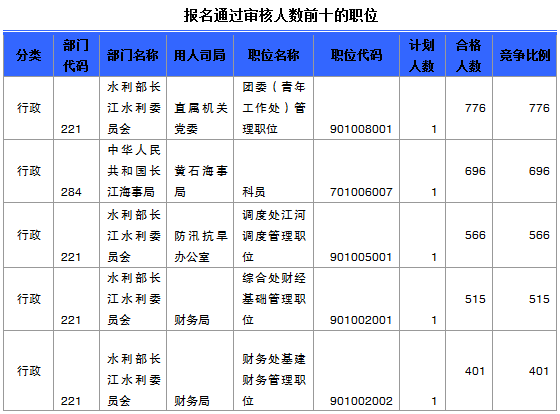 報名通過審核人數(shù)前十的職位主要集中在水利部長江水利委員會、湖北省國家稅務局等部門,具體信息如下: