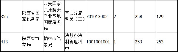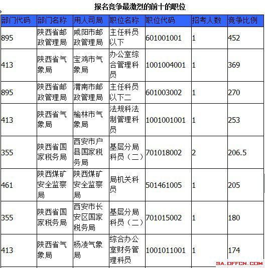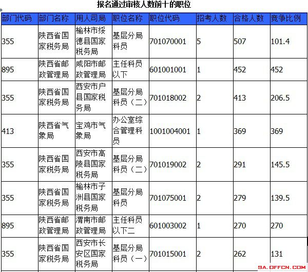 報名通過審核人數(shù)前十的職位主要集中在陜西省郵政管理局、陜西省氣象局、陜西省國家稅務(wù)局等部門,具體信息如下: