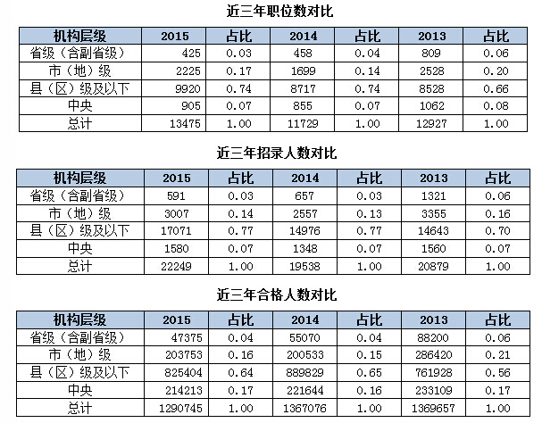 從機(jī)構(gòu)層級(jí)來(lái)看,三年來(lái)縣(區(qū))級(jí)及以下的職位數(shù)、招錄人數(shù)、合格人數(shù)在各層級(jí)中均占比。而今年縣(區(qū))級(jí)及以下的職位數(shù)和招錄人數(shù)比前兩年都高,而合格人數(shù)較去年卻下降6萬(wàn)多人,從一定程度上反映了考生依然不太喜歡選擇基層職位,加之今年很多基層職位為了留住人才,要求考生最低服務(wù)年限為5年,這也卡掉了一大批想報(bào)基層的考生,縣級(jí)以下職位報(bào)考不如往年“”。中公教育提醒考生,不“熱”對(duì)考生來(lái)講是個(gè)好消息,可以減少“炮灰”幾率。
