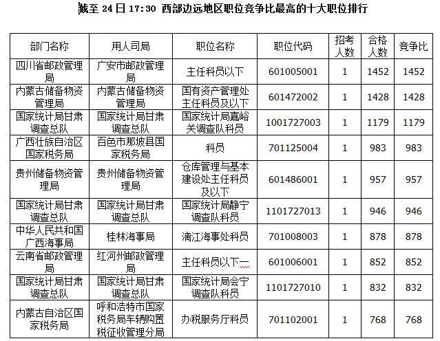 從西部邊遠(yuǎn)職位來(lái)看,截至24日17:30共審核通過(guò)347523人,平均競(jìng)爭(zhēng)比41.7:1,低于2015國(guó)考平均競(jìng)爭(zhēng)比,有72個(gè)職位無(wú)人通過(guò)審核。四川郵政管理局廣安市郵政管理局主任科員以下職位過(guò)審人數(shù)最多,已有1452人過(guò)審。