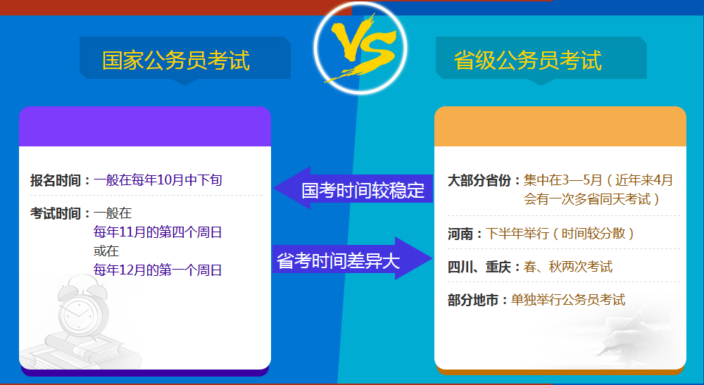 省考和國(guó)考在考試時(shí)間、考試內(nèi)容、考試地點(diǎn)和考試難度方面都存在或多或少的差異。就考試時(shí)間而言,國(guó)考時(shí)間基本是固定的,報(bào)名時(shí)間在每年10月中旬,考試時(shí)間在11月下旬,面試時(shí)間在來(lái)年2-3月份。而各省省考時(shí)間則不相同,近年來(lái)參加聯(lián)考的省份越來(lái)越多,2016年參加聯(lián)考的地區(qū)已經(jīng)增至25個(gè),為歷年之最。